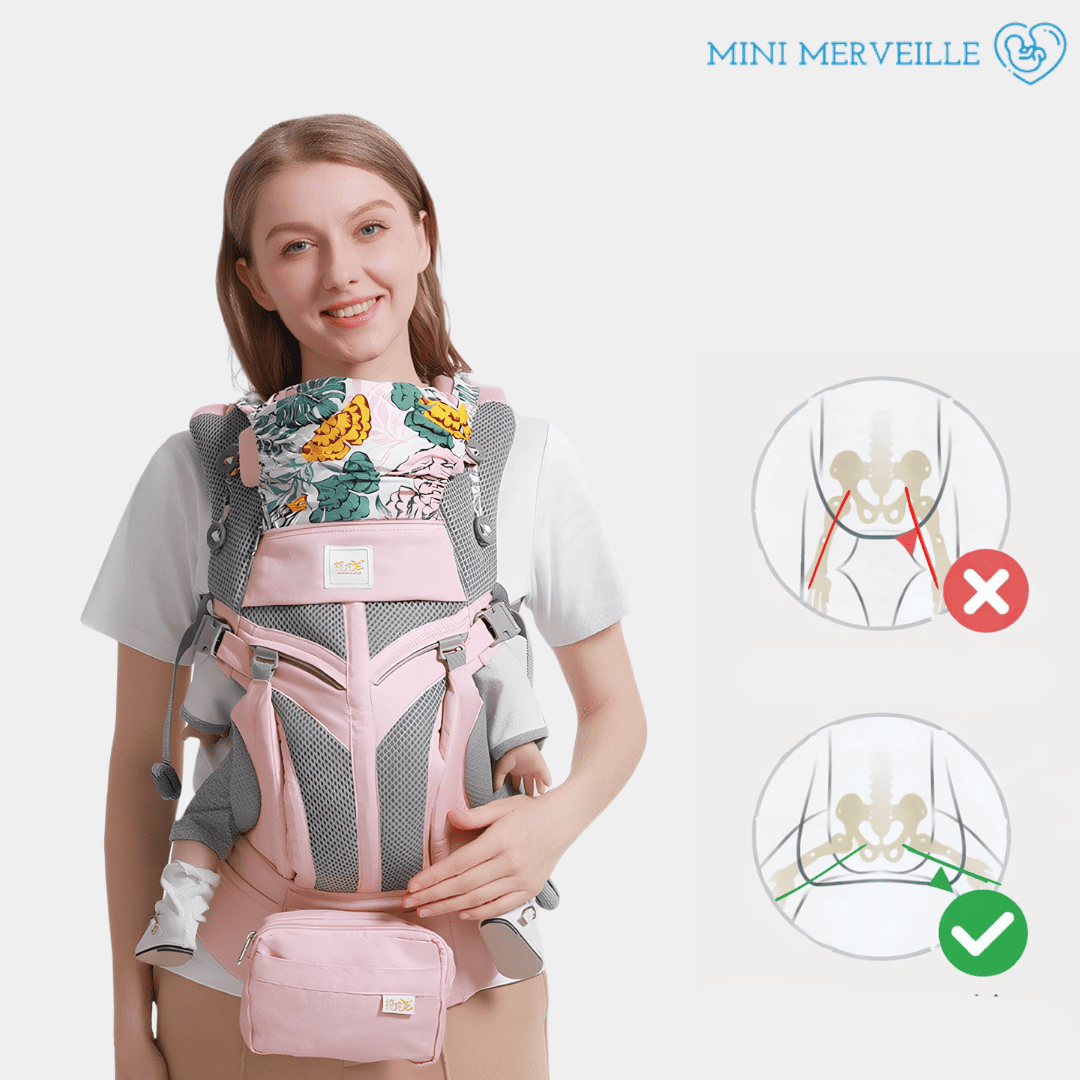 Notre porte-bébé est spécialement conçu pour assurer un soutien sûr et ergonomique dès la naissance, offrant un positionnement adéquat pour le développement de la colonne vertébrale et des hanches.